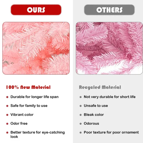 Bring this Christmas tree home to create you're desired yet unique Christmas atmosphere.Unique cherry blossom pink color for an eye-catching decorationFull-bodied look with flourishing leaves for lush design3 Hinged sections for easy assembly, disassembly and storage100% New PVC material, no odor, non-flammable, non-allergic, superior to recycled oneExcellent durability, for enjoyment years after yearsA sturdy iron stand keeps the tree stand in an upright position all season longSuitable for home and commercial use, for wedding, birthday and Christmas party